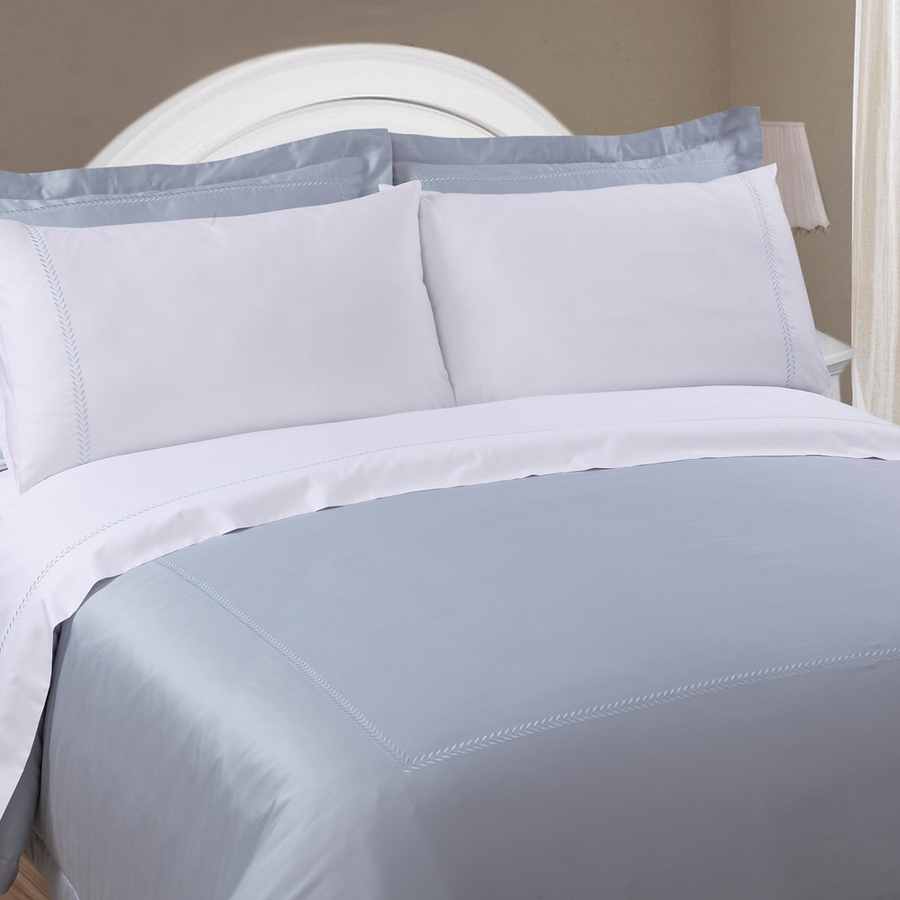 White with 4″ hem in chocolate brown color decorated with sky blue trim on flat sheet and pillowcases.